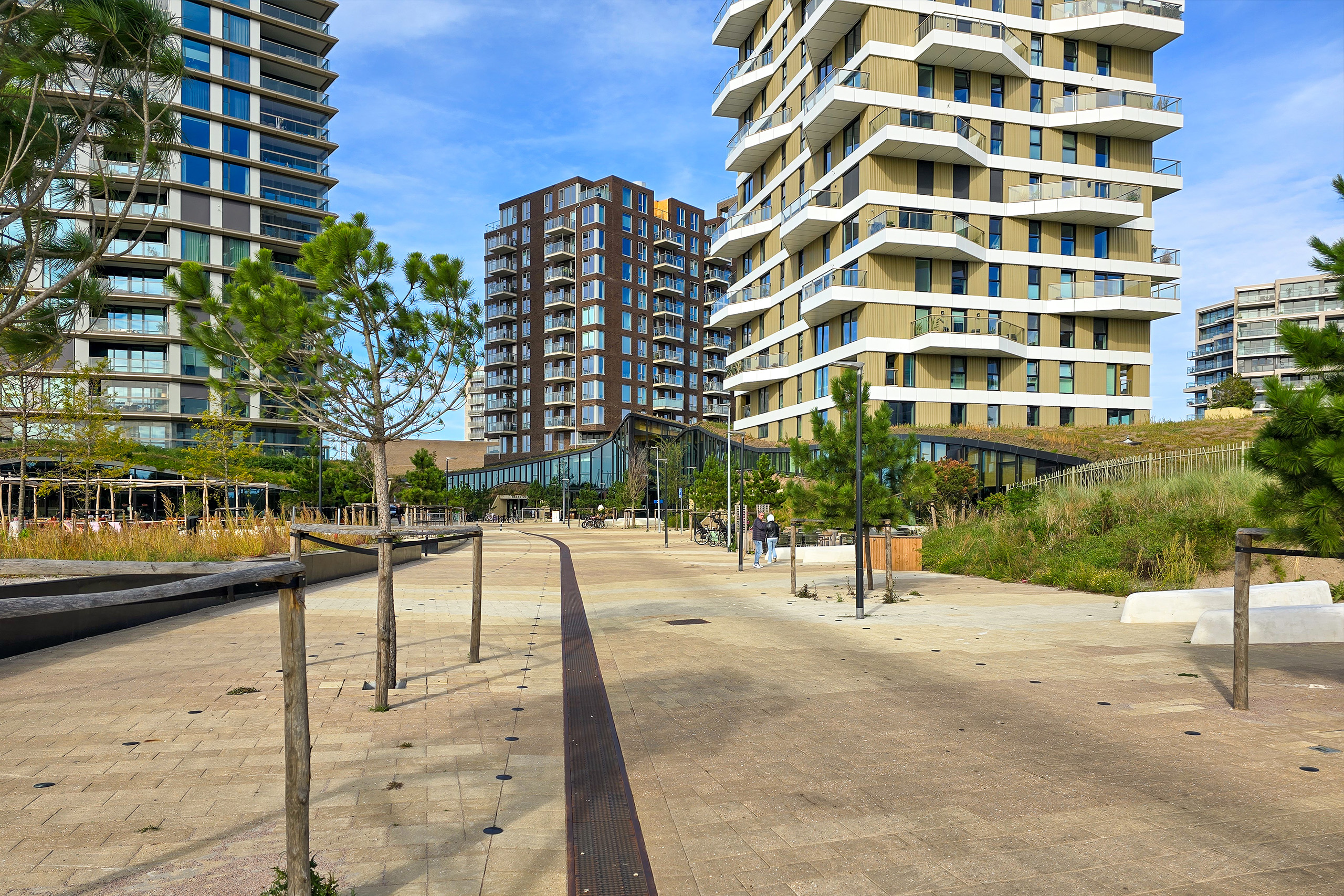 Het DUINplein in Almere is officieel opgeleverd en vormt vanaf nu het bruisende hart van de wijk. Door hoogteverschillen, kleurverlopen en structuren die een echte duinpan nabootsen, haalt het plein het gevoel van strand en duinen de stad in. De speciale straatstenen met schelpen in de toplaag versterken dat natuurlijke strandgevoel en geven het plein een warme, uitnodigende uitstraling. Ook de golvende vormen in het straatwerk springen in het oog; ze zorgen voor een speels beeld dat mooi aansluit bij de omgeving.