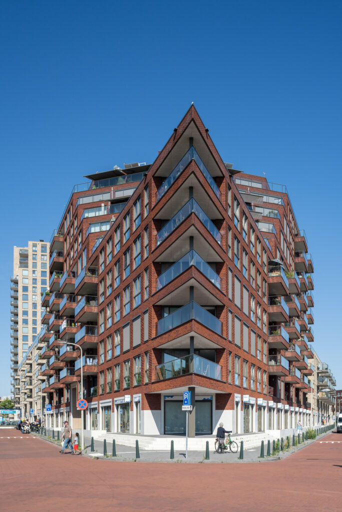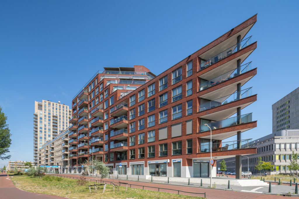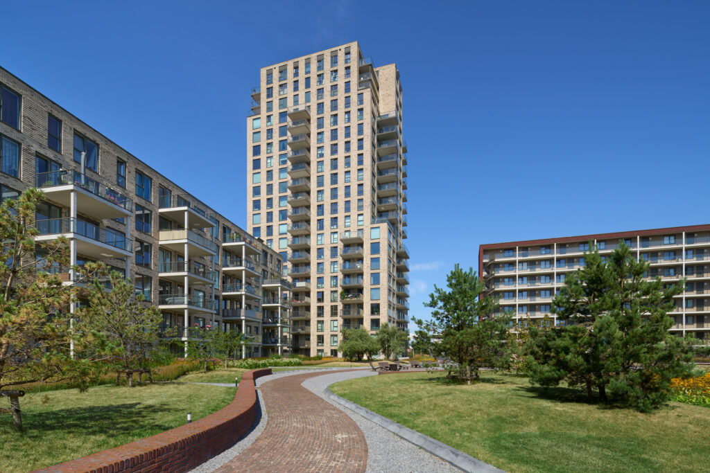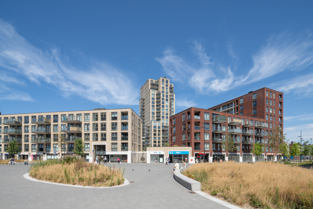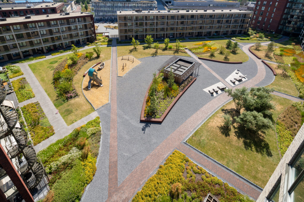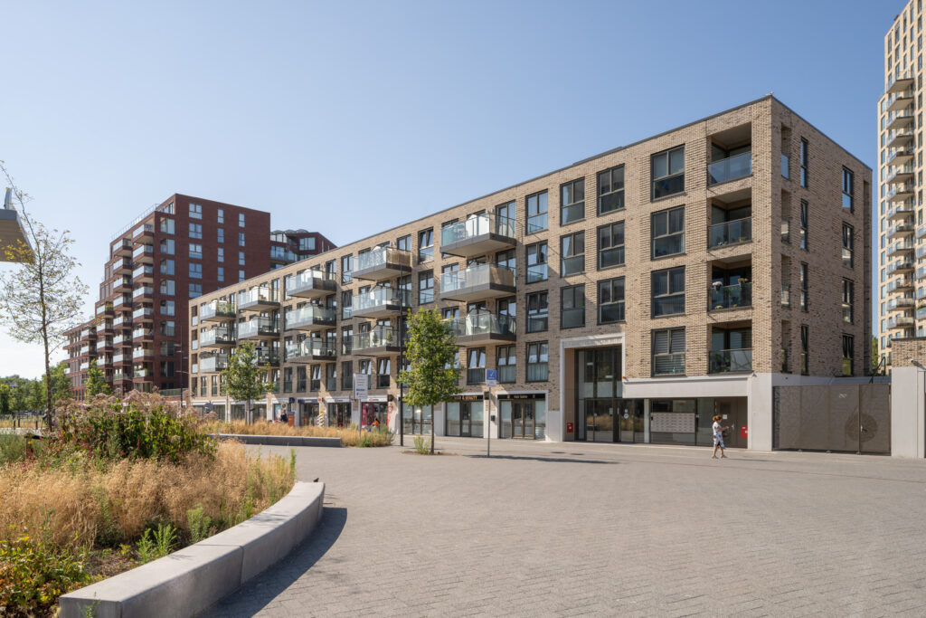 631 woningen, 1080 parkeerplaatsen, 7200 m² daktuin en 3180 m² commerciële ruimte